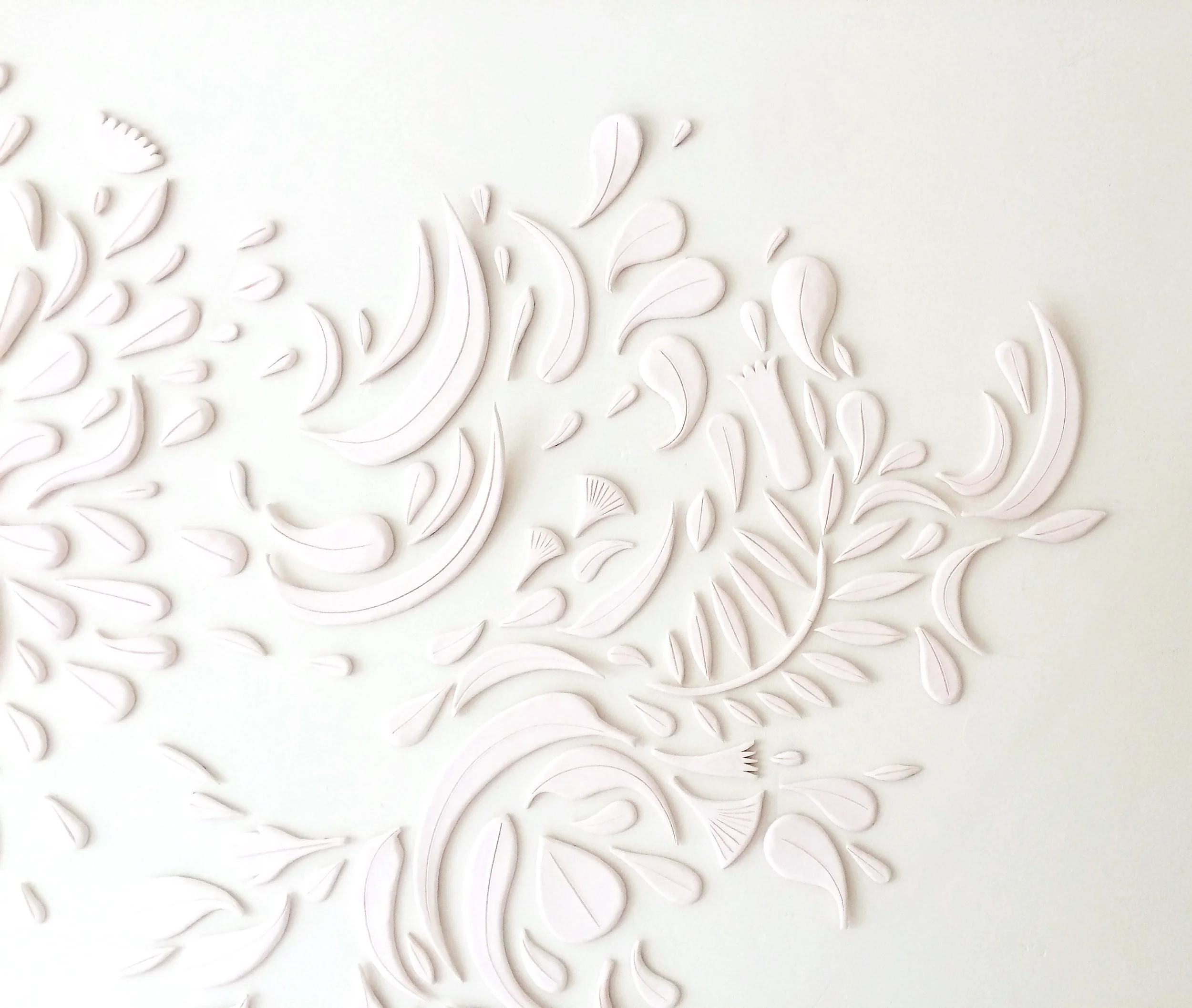 Botanical mural made out of beautiful white porcelain, the first of its kind. The pieces are organically assembled by eye and hand. The wallpaper has a calming effect on the eye, and adds a beautiful dimensionality to blank walls.